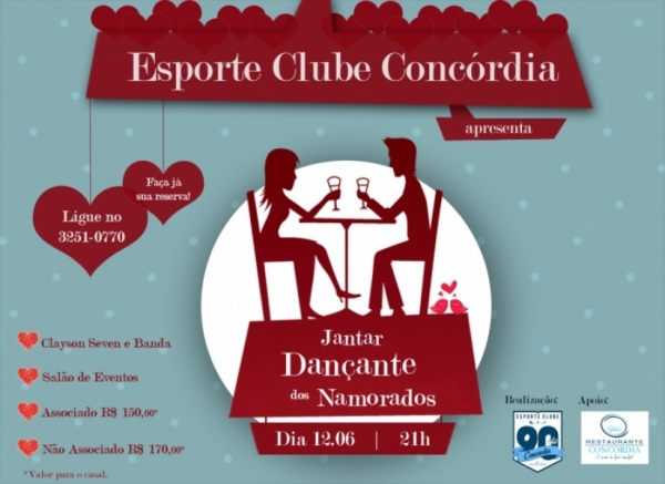 É o Jantar Dançante dos Namorados, que nesta edição será comemorado no Salão de Eventos do Clube e com a parceria do Restaurante Concórdia.